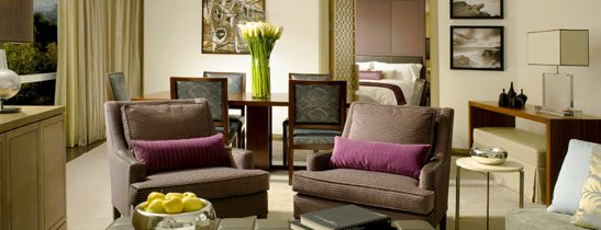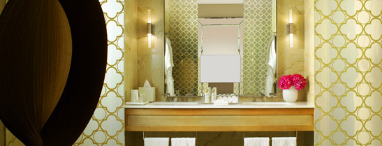 Exquisitely designed with a neutral color palette infused with fresh green and bold purple accents, the 1,098 square-foot Luxury Suite embraces guests in a private world of plush comforts and discerning style. Outside, city views captivate the eye and imagination while inside, accents of fine sycamore, laser-cut silver mosaic screens and custom metal and leather-work details by local artisans compliment contemporary sofas and chairs. Wood floors and beautiful area rugs in the living area, separate dining area and bedroom give way to pale green marble floors in sumptuous bathrooms.