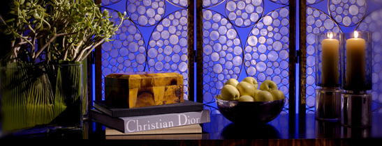 Designed with a neutral color palette infused with fresh green and bold purple accents, the entire St. Regis Suite embraces guests in a private world of plush comforts and sumptuous style. Accents of fine sycamore, laser-cut silver mosaic screens and custom metal and leather-work details by local artisans compliment contemporary sofas and love seats. Wood floors adorned with handcrafted rugs in the living areas give way to pale green marble floors in two sumptuous bathrooms.