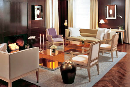 The beautifully crafted furniture in this room includes a Starck-designed English sycamore custom sleigh bed and, inspired by artist Man Ray, a whimsical wood chair in the form of a wheelbarrow. Floor-to-ceiling mirrors create a soothing ‘infinity effect.’ Sumptuous MALIN+GOETZ bath amenities refresh and restore. Enjoy the state-of-the-art entertainment center and wireless access when you want to tune in or log on. Revel in the luxurious 400 thread count Italian percale bedding, down duvet and imported Merino wool throw blanket when it’s time to rest.